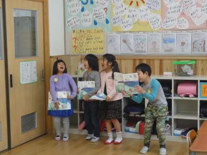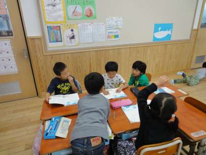 『くじらぐも』の学習では,音読発表会に向けて練習をしています。今回は,自分が好きな場面を選び,同じ場面を選んだ子どもたちとグループを組んで発表します。「どの場面も好きだな。」と,場面を選ぶのに悩んでいた子どもたちですが,一つ選び,グループで練習することができました。音読発表会が楽しみです。