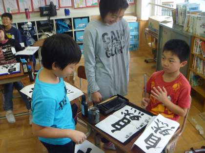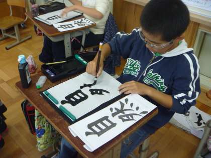 文字の大きさに気を付けて,書きました。半紙全体のバランスを考えながら書くことに苦戦していましたが,真剣に取り組みました。途中,同じ班の友達とのアドバイスタイムを設け,改善しながら何度も書くことに挑戦しました。