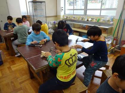 今日の図画工作の学習では,先週に引き続き金づちやくぎを使って,工夫して作品作りをしました。金づちの扱いにも少しずつ慣れ,木切れや板を組み合わせていくうちに,いろいろな形の作品に仕上がりました。