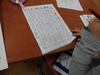 森林教室でお世話になった森林インストラクターの皆さんにお礼の手紙を書きました。楽しかった森林教室のことを思い出しながら、自分の思いを文字で伝えました。どんぐりで作ったキーホルダーのこと、いろんな葉っぱを見つけたこと、また一緒に衣笠山に登りたいこと、などなど。1枚に収まりきれず2枚書いている子もいました。