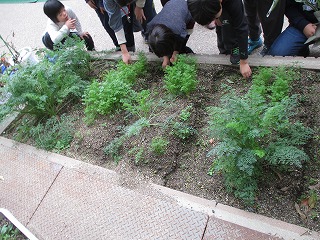 にじの子ガーデンのニンジンがまた一段と大きく育っています。密集して生えているところは間引きをし、小さいニンジンも何本か抜きました。子どもたちは触ったり、においをかいだり、自分たちで育てたニンジンをじっくりと観察していました。これからもっと立派なニンジンが収穫できるように育てていきたいです。