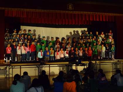 今日は,27日(金)の学習発表会本番に向けてのリハーサルでした。3年生は,衣笠山の生きものについて発表します。森林教室で森林インストラクターの方々に教えていただいたことや自分たちで調べたことなどを他の学年の人や保護者の方々に伝えるために今まで一生懸命練習してきました。今日のリハーサルでは,森林インストラクターの方々に来ていただき,本番の前に見ていただきアドバイスやお褒めの言葉をいただきました。子どもたちは,自分たちが教えていただいたことが,上手く伝えることができるのか心配でしたが,今日の森林インストラクターの方々の言葉で少し自信をつけたようでした。本番も今日のように大きな声で伝えられたらと思っています。