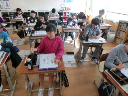 今日は,小筆を使って作品を作りました。芭蕉の句「この道や 行く人なしに 秋の暮」を,丁寧に書写しました。小筆の扱いに慣れるよい学習となりました。なかなかの秀作がそろいました。