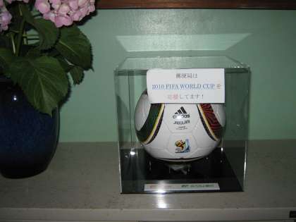 本校の南校舎入口に,今話題のワールドカップのサッカーボール(レプリカ)が展示してあります。