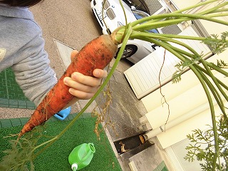 本日、にじの子ガーデンで育てているにんじんの収穫をしました。スコップでやさしく土を掘り返すときれいなオレンジ色が出てきました。「ぬけるかな〜」「わぁ大きいよ!」「見て見て〜」と子どもたちからうれしそうな声がたくさん聞こえました。これからの授業でにんじんのことを調べたり、実験をしたりしてさらに深めていきたいです。