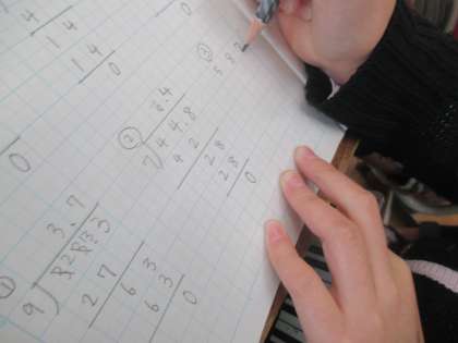 見通しをもつ段階で,整数と同じようにできるかもしれないという言葉を手掛かりに,小数÷整数の筆算の仕方を考えることができました。