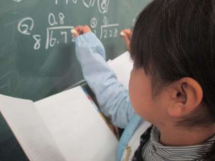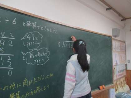 子どもたちは,どうしたらよいかを話し合い,商が立たないときは0をかき,位を揃えて小数点をうてばよいことに気が付きました。