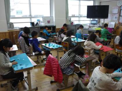 図工では,カッターを使って学習をしています。どんな形のまどにしようかな。まどの中からは何が見えるかな。創造を広げながら作品を作っています。