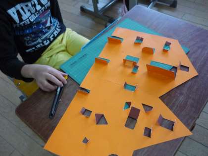 安全に気を付けながら,慎重にカッターを使って,窓を切っていきます。すてきな窓がたくさんできました。