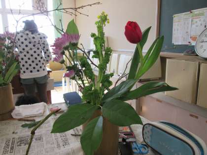 今回も,中村展山先生,中村博翠先生,古賀慧山先生の3人の先生にご指導をいただきました。今回の花材は,土佐ミズキ・スプレー菊・なたね・チューリップ・レモンリーフで,5種類の花材をがんばって生けました。