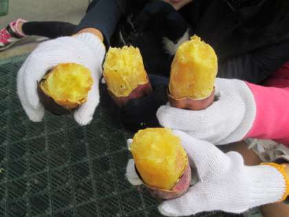 火に入れたサツマイモは,20〜30分ぐらいで,ほかほかの焼きいもに。中までほくほくで,とても甘くておいしいです。子どもたちも大喜びでほおばっていました。