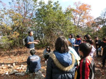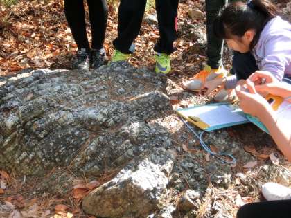 今日はい組が見学に行きました。大変いい天気で,気持ちよく衣笠山に登り,地層を見学してきました。まずは,衣笠山のふもとでむき出しになっている地層を観察しました。その後,山頂に登り,そこに突き出している地層を観察しました。どちらも同じ地層であることが分かり,一つの大きな山が一つの地層でできていることを観察することができました。スケールが大きすぎて,実感がわきにくいですが,自然の力というのはすごいですね。子どもたちと一緒に山を登りながら,雄大な自然の一部になったような気がして,気分もリフレッシュできました。