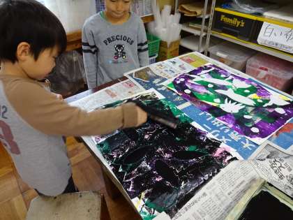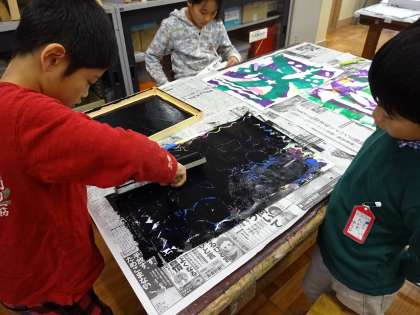 今日は,最後の作業の黒インクを塗りました。はがせるシールを貼っているので,黒のインクで塗ったとしてもシールの部分だけが黒インクでない色が出るようになっています。来週は,シールをはがしていきます。どんなふうになっているのか,シールをはがすまでわかりません。とても楽しみです。