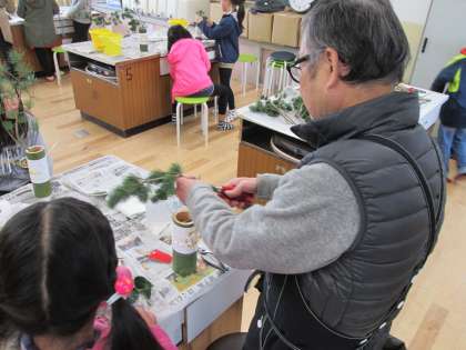 本日,14回目の生け花教室を実施しました。いよいよ今年度の生け花教室も残り2回となりました。今回も,中村展山先生,中村博翠先生,古賀慧山先生の3人の先生にご指導をいただきました。今回のテーマは,「お正月の花を生ける」で,花材は,五葉松・スプレーカーネーション・ろうばい・ガーベラ・千両の5種類の花材を生けました。