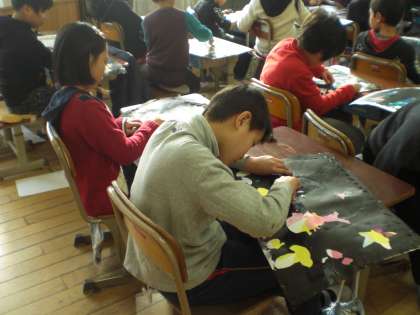 冬休みの間,しっかりと乾かした版画のシールを一つ一つ丁寧にはがしていきました。