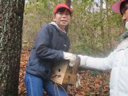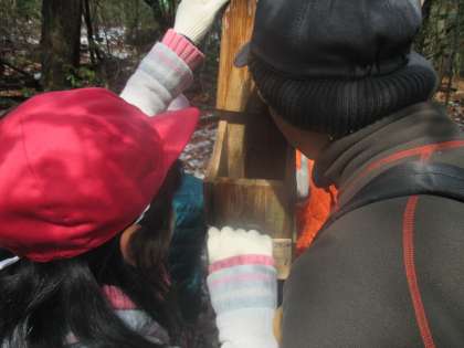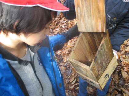 子どもたちは針金で止めてある巣箱を木から外し,上蓋をあけました。