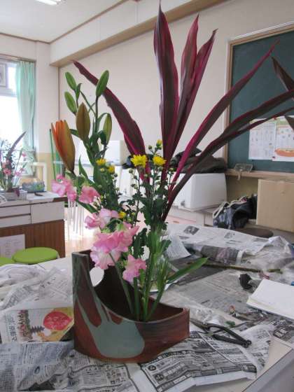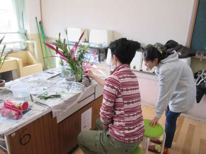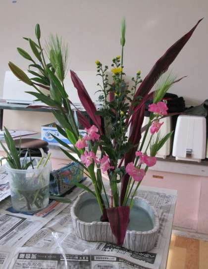 今回のテーマは「きくと最後の終了式」でした。花材の中に麦やスイトピーのような春を連想させる淡い黄緑やピンクの物もあれば,ドラセナやスカシユリのように,赤紫色やオレンジの鮮やかな色の物もあり,大変美しい作品が出来上がったと思います。毎回,先生方にご指導いただいたことやアドバイスを,作品に生かそうと子どもたちはがんばって活動することができました。