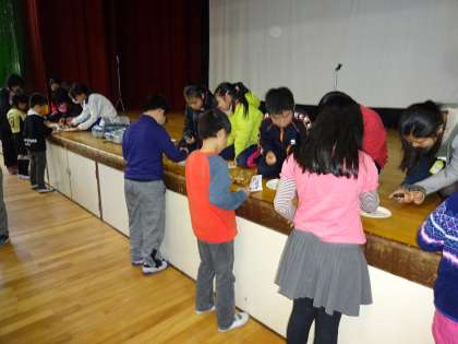 今週は,給食週間で今日は3年生の食育検定の日でした。中間休みに講堂で豆つまみを行いました。今年度は,食育検定の中級ということで,30秒間にいろいろな種類の豆を6つおはしでつまんでおとなりのお皿に移します。