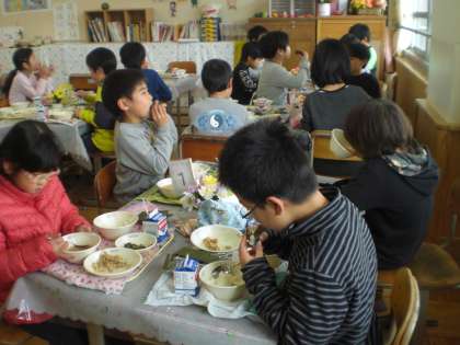 この日の給食は節分献立だったため,豆をしっかりかんで食べました。