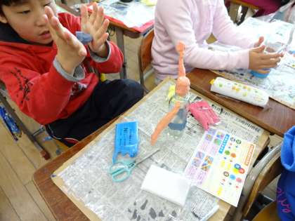 本日の図画工作では,ガラスびんに針金の手をつけるとどんな人に変身するのかみんなで話し合ってから,カラーの紙粘土で自分が作りたいポーズを作っていきました。カラーの紙粘土は,赤・青・黄・白の4色しかありませんでしたが,絵の具の色を混ぜる学習を生かして,