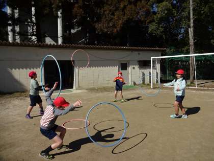 今週から,体育でようぐ遊びをしています。フラフープ・一輪車・ボール・棒・短縄・大縄の6種類の用具を使って,いろいろな遊びに挑戦しています。新しい使い方を知り,楽しんでいました。