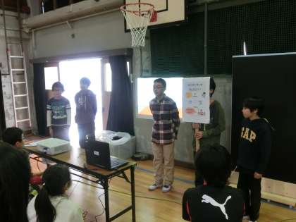 総勢35名ほどの来校者がありました。講堂で発表会をしました。