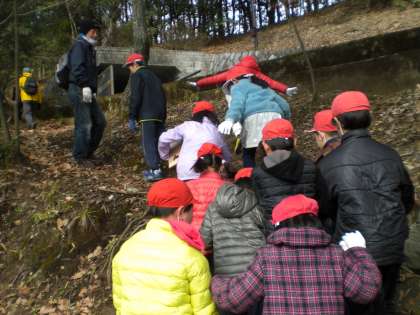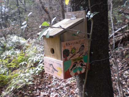 いよいよ,巣箱を持って衣笠山に上がります。いつもの林道ではなく少しけもの道のようなところを上がっていき,鳥が来そうな木に巣箱をつけました。