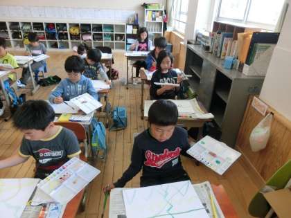 今日は,3年生になって初めての図画工作科の授業をしました。絵の具の基本的な使い方を学んだあと,混ぜて作った色を使って,線や点で模様を描きました。