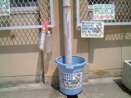 管理用務員さんに助けていただき,校舎の雨水排水パイプの下にポリバケツを設置しました。