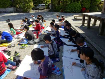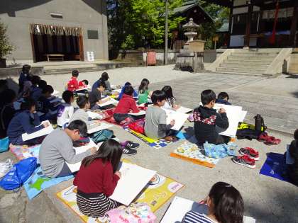 今日は,図画工作でわら天神に行きました。4年生に進級して初めての学習で,校外に出るということで,朝から子どもたちもとても楽しみにしていました。