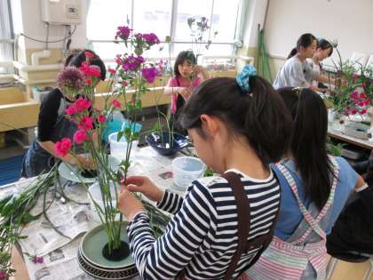 今年度は,20人を超える子どもたちが参加します。初めて生け花教室に参加する子どもたちも一生懸命生けました。