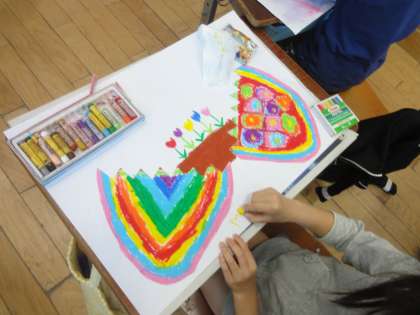 図画工作科では,『ひみつのたまご』の中を描き,作品を完成させました。それぞれに,自分の想像した世界を描くことができ,満足そうな様子で作品を見せてくれました。来週には,クラスみんなで鑑賞会を行います。