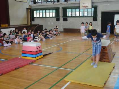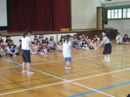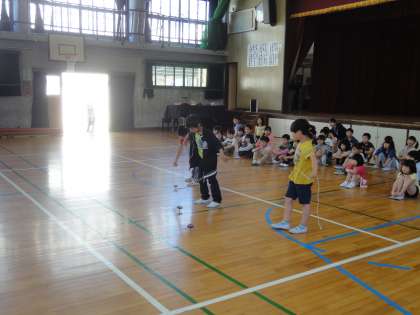 1年生の1年間でできるようになったことを発表しました。こままわし,けんばんハーモニカ,マット,跳び箱,なわとび,音読とどれも練習をした成果を十分発揮することができました。1年生からはたくさんの拍手と歓声をもらいました。
