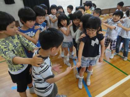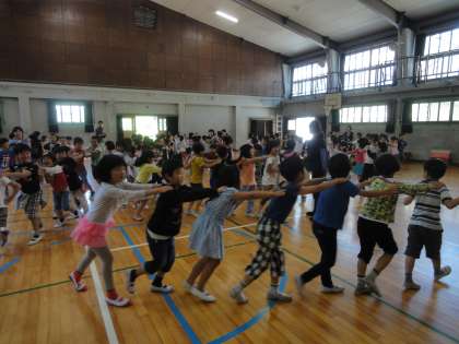 1,2年生みんなで『じゃんけん列車』をして遊びました。子どもたちみんなの笑顔が講堂に広がっていました。遊びを通して,1年生と2年生の距離が近くなりました。