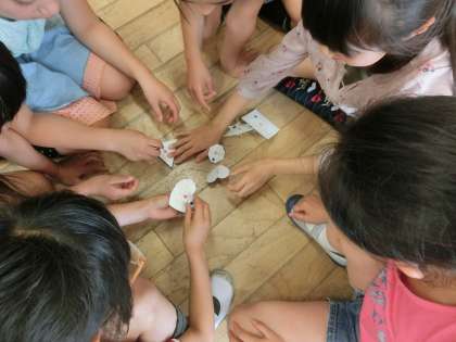円の性質を知るためには,コマづくりが最適です。というわけで,画用紙とつまようじを使ってコマづくりに取り組みました。「きれいな丸の方が,よく回る。」ということに気付いた子どもたち。その形を円ということを伝えました。詳しい円の構成要素はのちのち教えていきます。とっても楽しそうにコマづくりに取り組んでいた子どもたち。辞書引きに引続き,今度はコマづくりが流行りそうです。