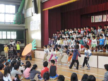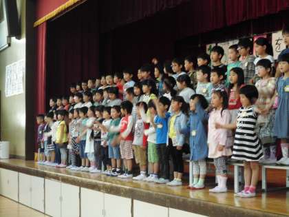 1年生はお礼の言葉と歌をお返ししました。たくさん練習してきた,ふりを付けた「アイアイ」を歌いました。