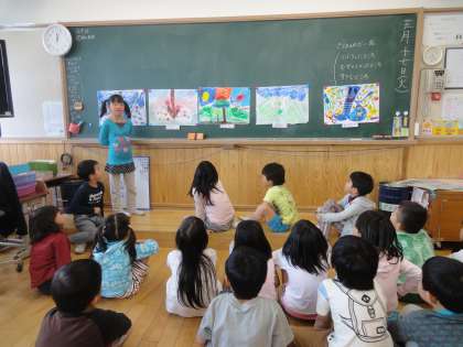 図画工作科『ひみつのたまご』の鑑賞会をしました。自分が作った作品の題名や,工夫したところなどを発表しました。また,友達の作品を見て,素敵だなと思ったところを発表し合いました。良いところを言う際には,「この部分がすごいなと思いました。」だけでなく,「こんな工夫がされているからすごいと思いました。」と,詳しく伝える姿に成長を感じました。