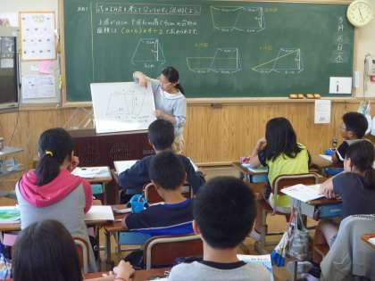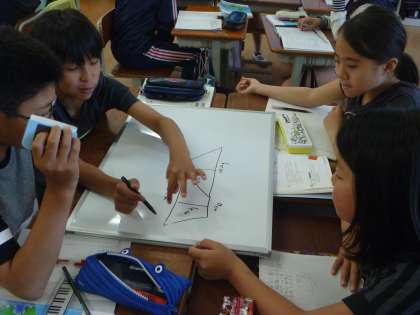 算数科の学習で,文字を使った式が表す意味を考えました。グループごとに,式が表す意味をいろいろに考え,説明し合いました。一人では難しくても,友達の考えを聞くことで,分かることが増えます。また,相手に分かるように説明することも大切です。