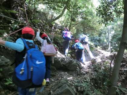 登山の途中では,ロープを使って慎重に登らないといけないようなところもあり,緊張感を持って登りました。子どもたちは登りごたえがあってとても楽しそうにしていました。
