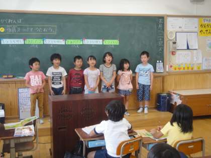 音楽科の学習では,『かくれんぼ』という歌を歌いました。この歌には,問いと答えが隠れていることに子どもたちは気付き,グループに分かれて,強弱を工夫して歌う練習をしました。練習の後は,みんなに発表をしました。どのグループもしっかり工夫して歌うことができました。