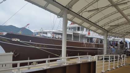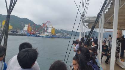 福良港から「咸臨丸」に乗船して,うずしおの見学に出発します。1時間ほどの船旅です。大自然が作り出すパノラマを間近に見られるのももうすぐです。わくわくします。