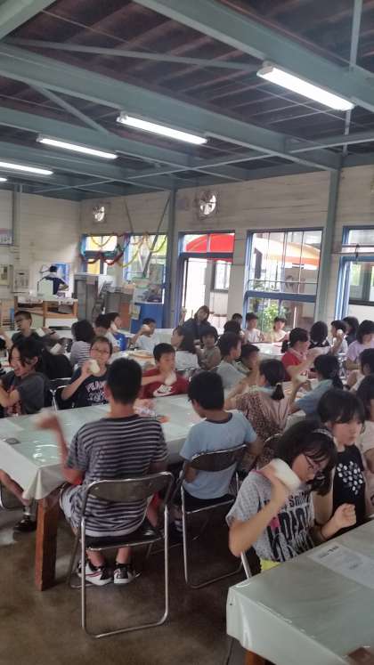 玉ねぎの収穫体験のあとは,バター作りに挑戦しました。牛乳と生クリームの入った容器を約5分間,一生懸命振ります。しばらくすると,中味が固まってきます。そっとふたを開けると,きれいな黄色のバターができていました。できあがったバターは,クラッカーにつけて,おいしくいただきました。