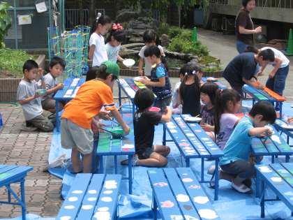 子どもたちに 出来上がったベンチに絵をかいてもらいました。