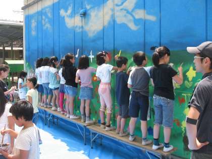 PTA主催のふれあい土曜塾で「校舎のかべに絵をかこう」というイベントを行いました。中庭の貯水槽のかべにあらかじめ,下準備をしておいたところに子どもたちが思い思いに絵をかいてくれました。