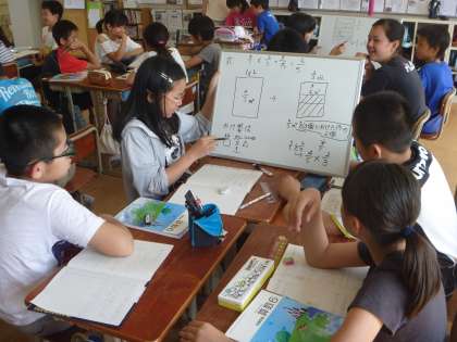 分数×分数の計算の仕方や,計算の意味をグループで集まって説明しあっています。自分で問題を解くことはできても,説明するのはなかなか難しいです。友達に分かるように伝えようと,がんばっています!