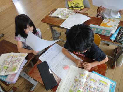国語科では,「ともこさんはどこかな」の学習をしています。前時では,大事なことをおとさずに聞き,迷子の子どもを教科書から探す学習をしました。今日は,前時の学習を活かし,大事なことをおとさず話すことをめあてに学習しました。迷子のお知らせを紙に書いて,大事なことがしっかりと書かれているか確認し,友達に問題を出し合いました。迷子の子どもの特徴をしっかりと捉え,アナウンスをすることができていました。