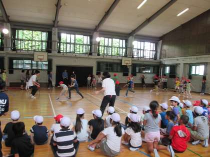 「しっぽ取り」と「ドッジビー」をしましたが,児童と保護者が対戦する形式をとったので,大変盛り上がりました。