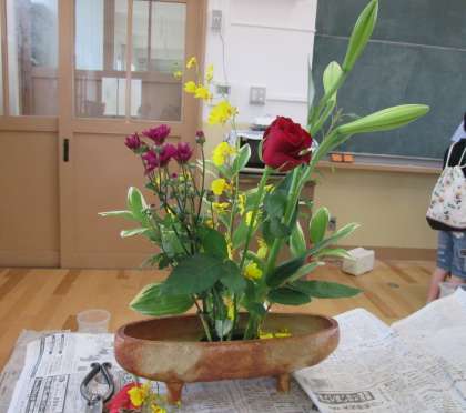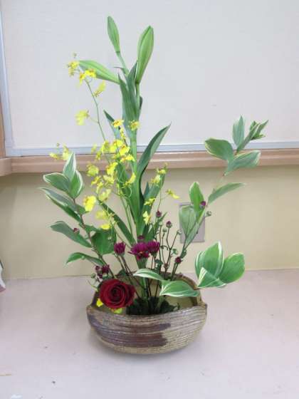前回同様に,まず生け花についてのお話を聞かせていただいた後に,実習に入りました。今回は鉄砲百合,オンシジウム,バラ,小菊,ナルコユリ(葉)を花材として生けました。