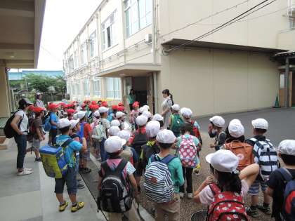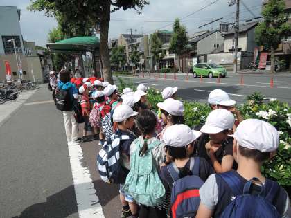 学校で班の役割や持ち物を確認して出発してバス停まで。