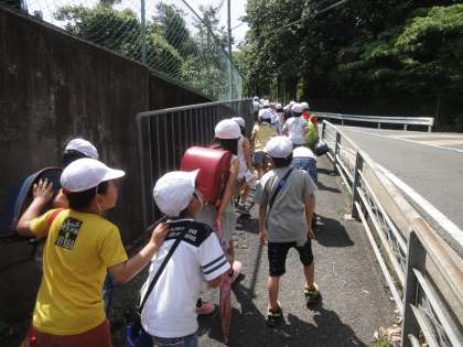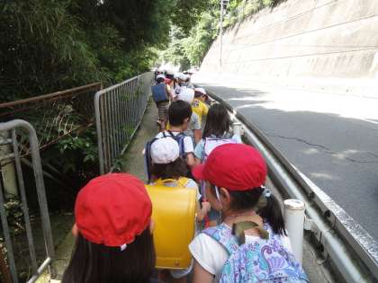 今回の町探検では,原谷に出かけました。初めて原谷に行く子どもたちもたくさんいた中,あの長い坂道を一生懸命上りました。天気がとてもよかったこともあり,なかなか終わりのない坂道を汗だくで上りきりました。毎日あの坂を上り下りしている友達がいることに驚いていました。
